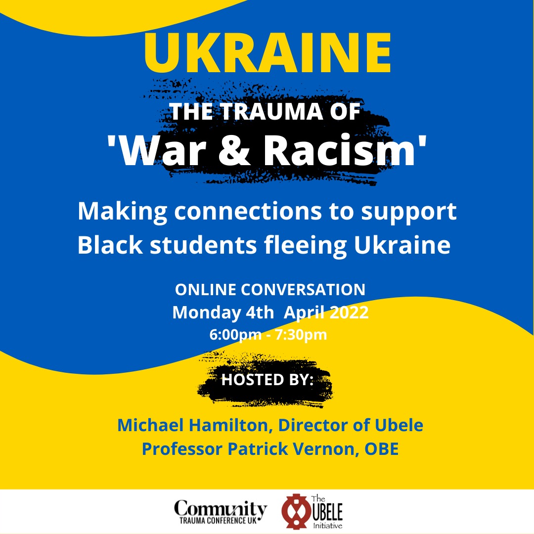 The Trauma of War and Racism Monday 4th April 2022, 6pm – 7:30pm – Online Making Connections to Support Black Students Fleeing Ukraine.